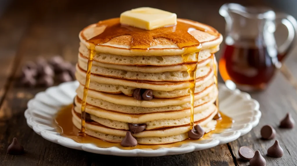 They’re soft, tall, golden, and studded with melty chocolate chips that make you question why you ever settled for plain pancakes.